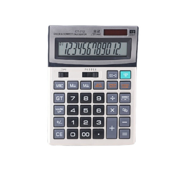 Solar calculator, 12 digit display, comfortable buttons, large screen display, 120 calculation checks, dual power supply