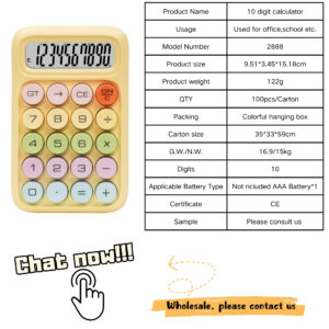 The HY Mechanical Button Calculator (Model: 2888C) is a compact and vibrant 10-digit calculator designed with mechanical-style buttons that provide a satisfying tactile experience. Perfect for office desks, classrooms, or home use, this calculator combines classic mechanical feel with modern colorful styling, delivering both performance and comfort in every keystroke.